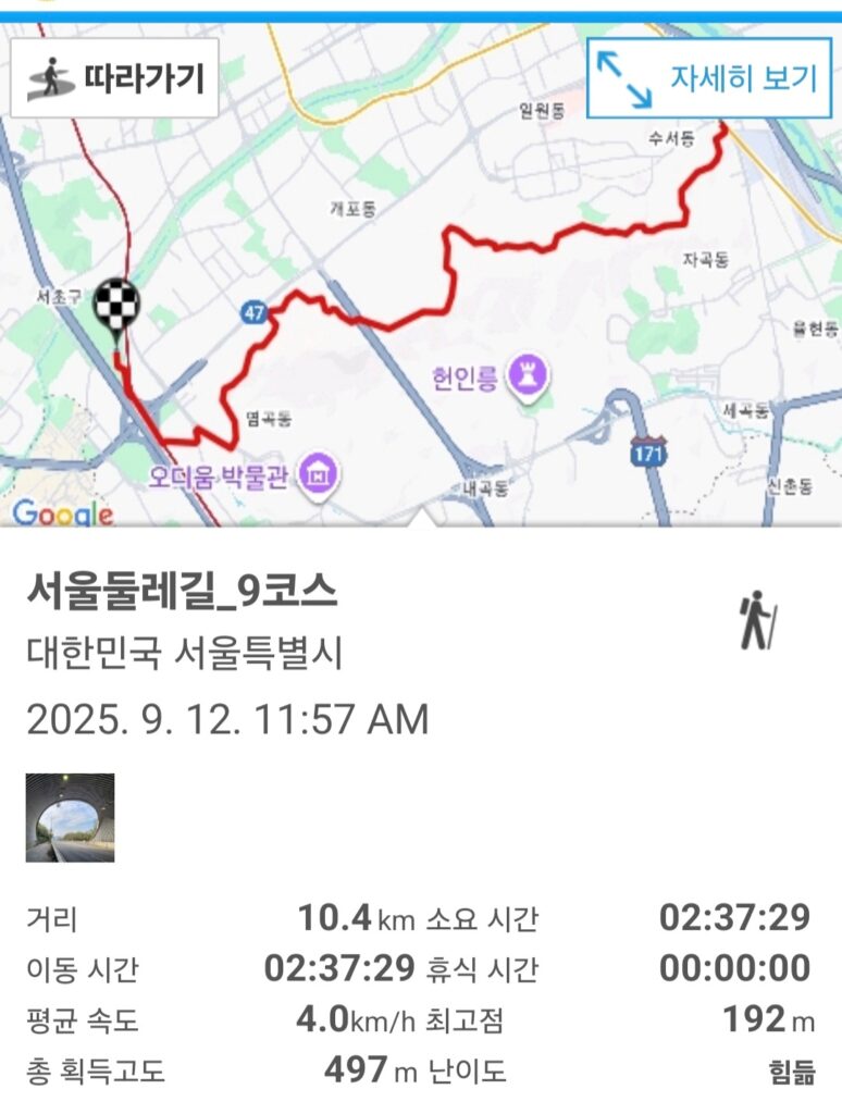 서울둘레길 9코스는 8코스의 종점인 수서역에서 시작하여 대모산과 구룡산의 허리를 돌며 매헌시민의숲까지 이어지는 약 10.7km의 트레킹 코스입니다. ‘자연생태 유람길’이라는 테마에 걸맞게, 도심 속에서도 깊은 산림욕을 만끽하며 서울 전경을 조망할 수 있는 매력적인 산악길입니다.