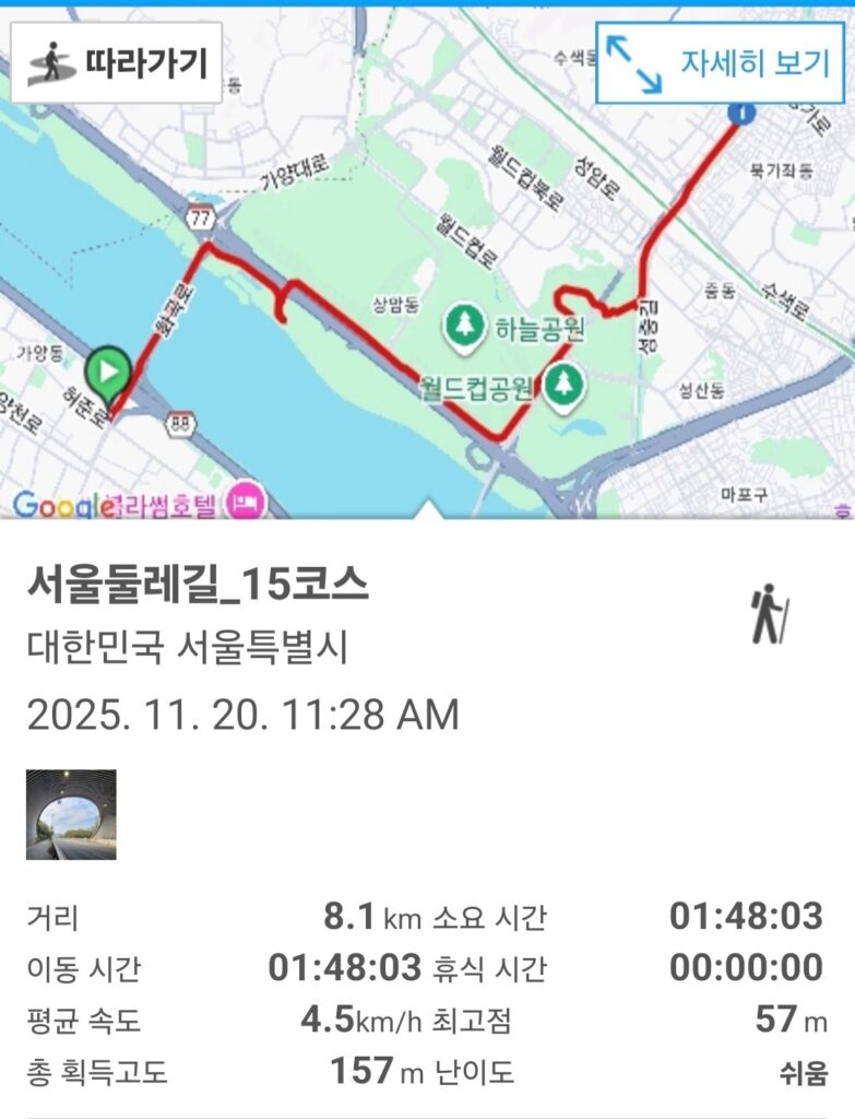 서울둘레길 15코스는 한강와 월드컵공원의 대표적 생태특구를 잇는 친환경 코스입니다. 노을공원과 하늘공원, 한강.습지 등 도심에서는 드물게 만나는 자연의 정취를 가까이하며, 계단이나 오르막이 있지만 전체적으로 완만하고 잘 정비되어 있어 누구나 부담 없이 다녀올 수 있습니다.