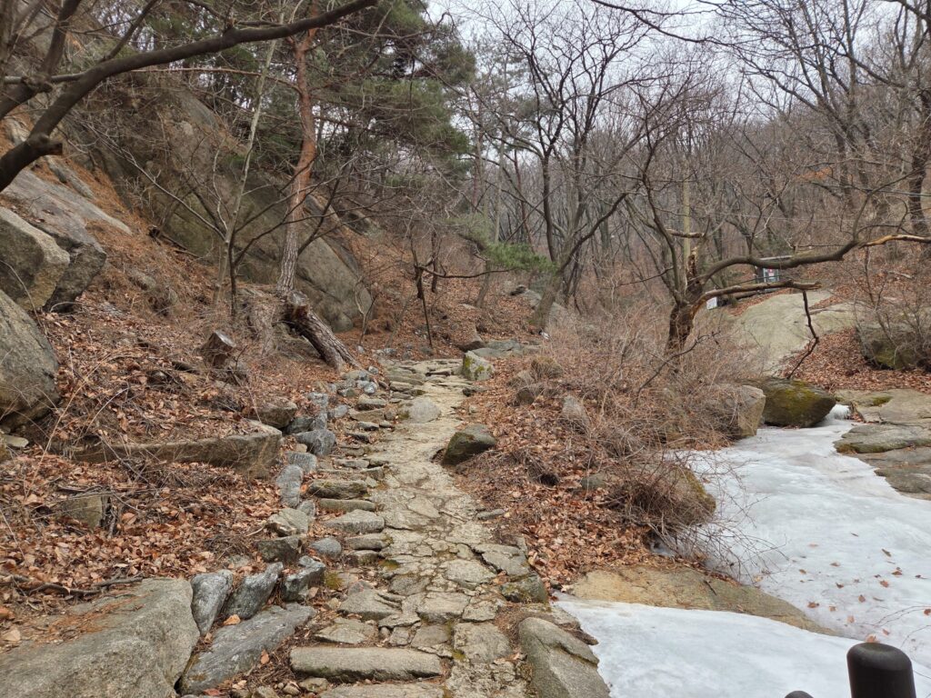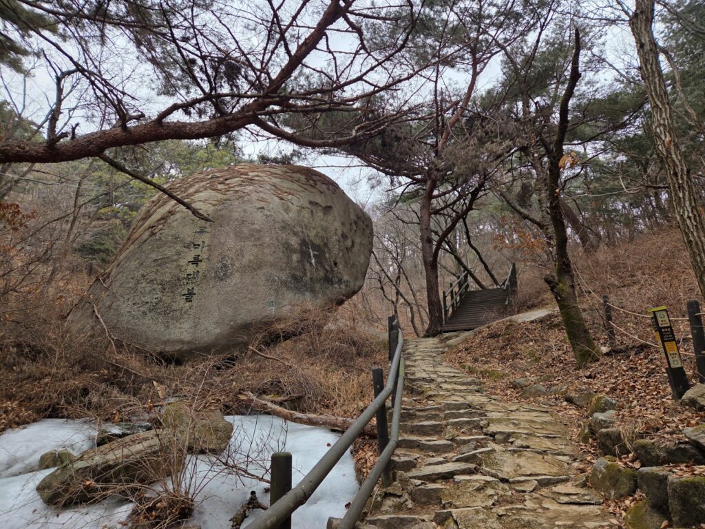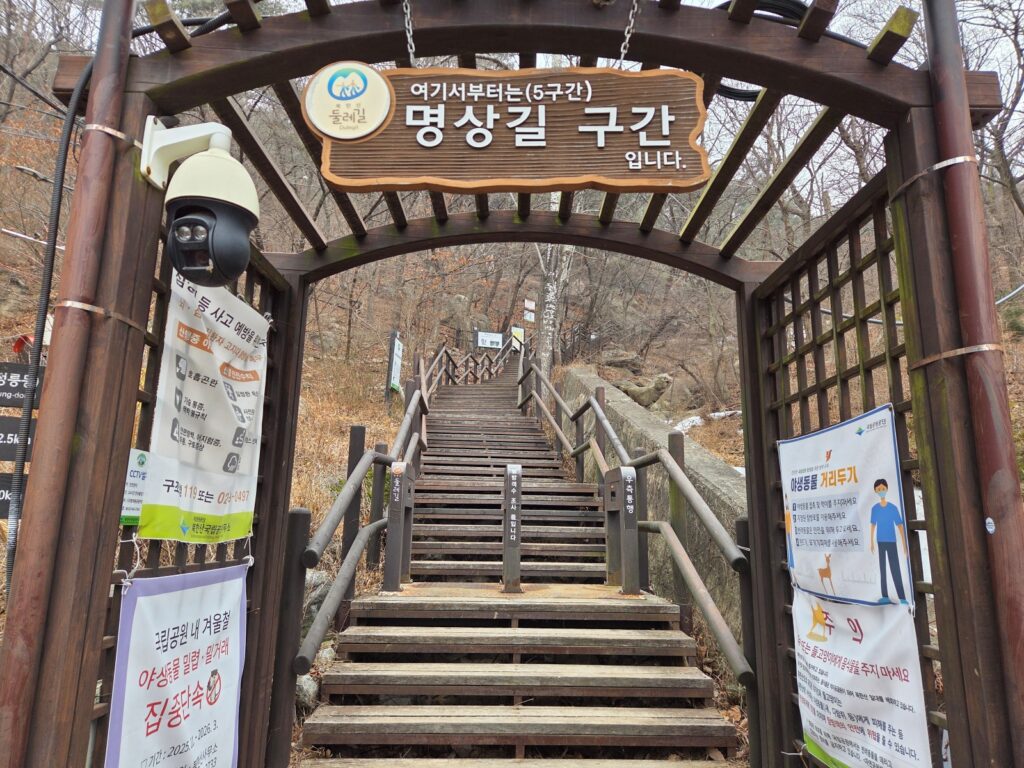 주의할 점은 시작점의 오르막을 지나면 급경사 오르막이 거의 없어 전체적으로 평탄하다고 느껴질 수 있으나, 실제로는 내리막 구간과 바위길이 많은 편이라는 점입니다. 따라서 비나 눈이 온 뒤, 또는 낙엽이 많이 쌓인 시기에는 미끄러지지 않도록 특히 주의하는 것이 좋겠습니다.