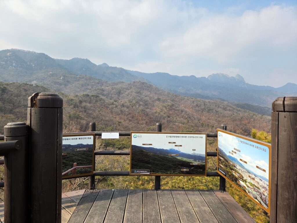 북한산둘레길 ‘흰구름길’ 구간의 하이라이트입니다. 약 12m 높이의 원형 계단을 올라가면 360도 파노라마 뷰가 펼쳐집니다. 북한산과 도봉산의 웅장한 능선은 물론, 멀리 수락산과 불암산, 서울 도심까지 한눈에 담을 수 있는 최고의 조망 명소입니다.