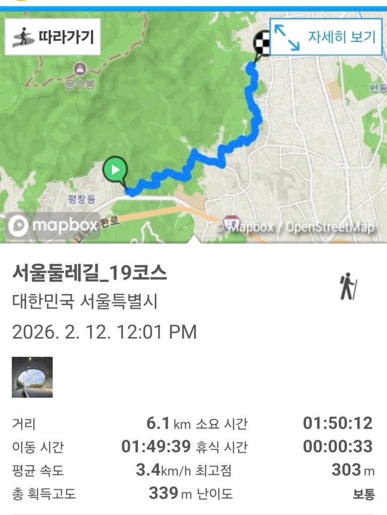 서울둘레길 19코스(북한산 성북)는 약 6km, 2시간 50분 내외로 소요되는 중급 난이도의 코스로, 길이가 길지 않아 부담 없이 걸을 수 있는 숲길과 도심길이 어우러진 코스입니다.