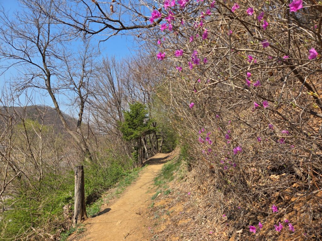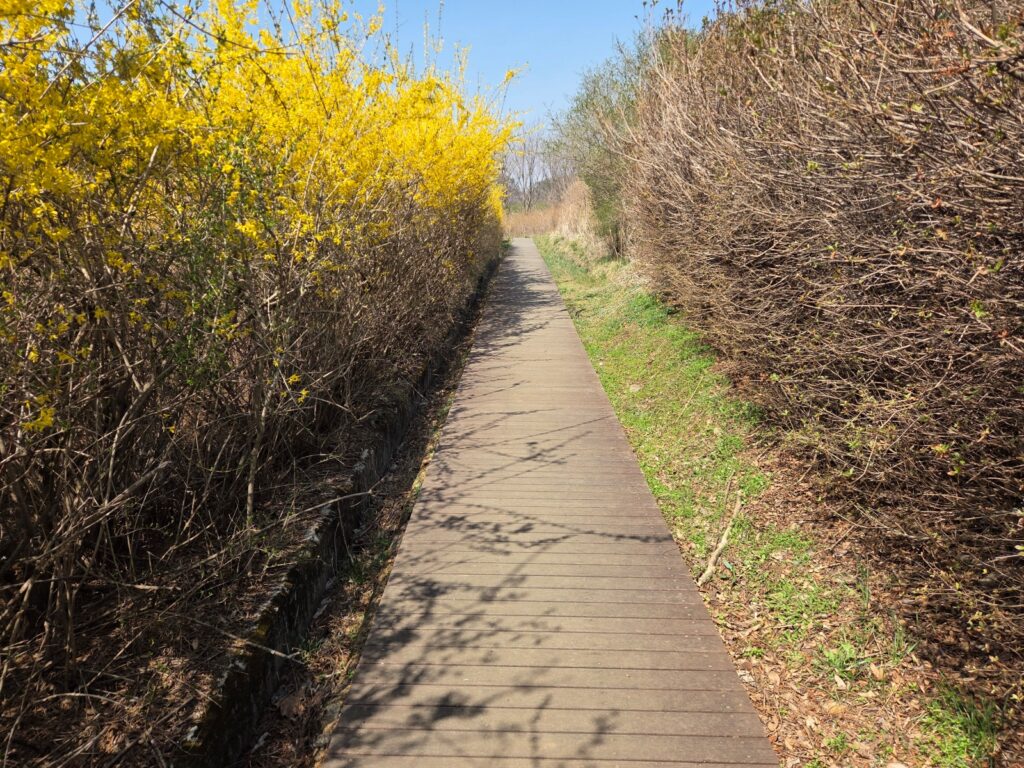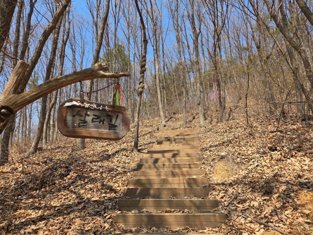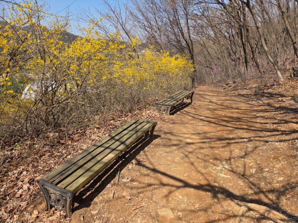후반부에는 ‘숲에서 시작하고 숲에서 끝내는 걸음’이라는 이름처럼 검단사 입구에서 시작되는 살레길로 이어지며, 초반 심학산 구간과는 또 다른 숲길의 분위기를 보여줍니다. 길을 걸으며 개나리와 진달래가 피어나는 모습을 볼 수 있어 봄이 오는 모습과 함께 계절의 변화를 느낄 수 있었습니다.
