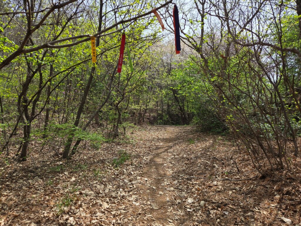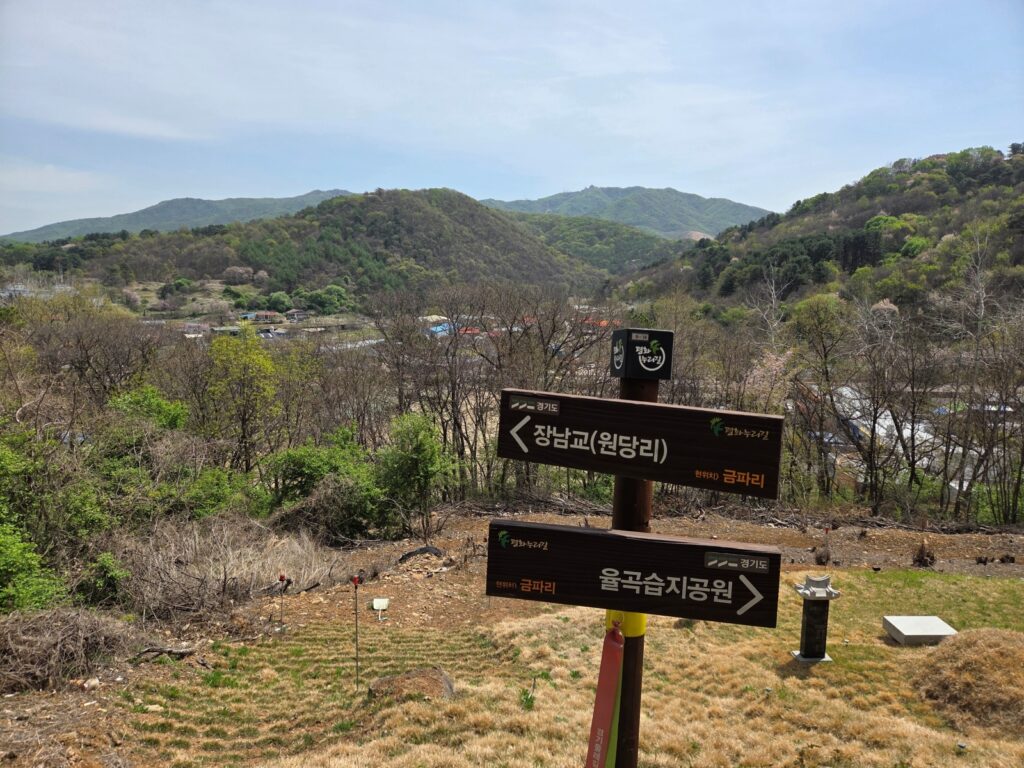 율곡습지공원을 벗어나면 왼쪽 철책 너머로 임진강이 보이지만, 진행 방향은 길을 건너 율곡수목원 쪽입니다. 두포삼거리를 지나면 산길을 따라 파평면 행정복지센터로 이어지는데, 마을 주변의 낮은 산을 지나며 조용한 숲속 산책로를 걷게 됩니다.